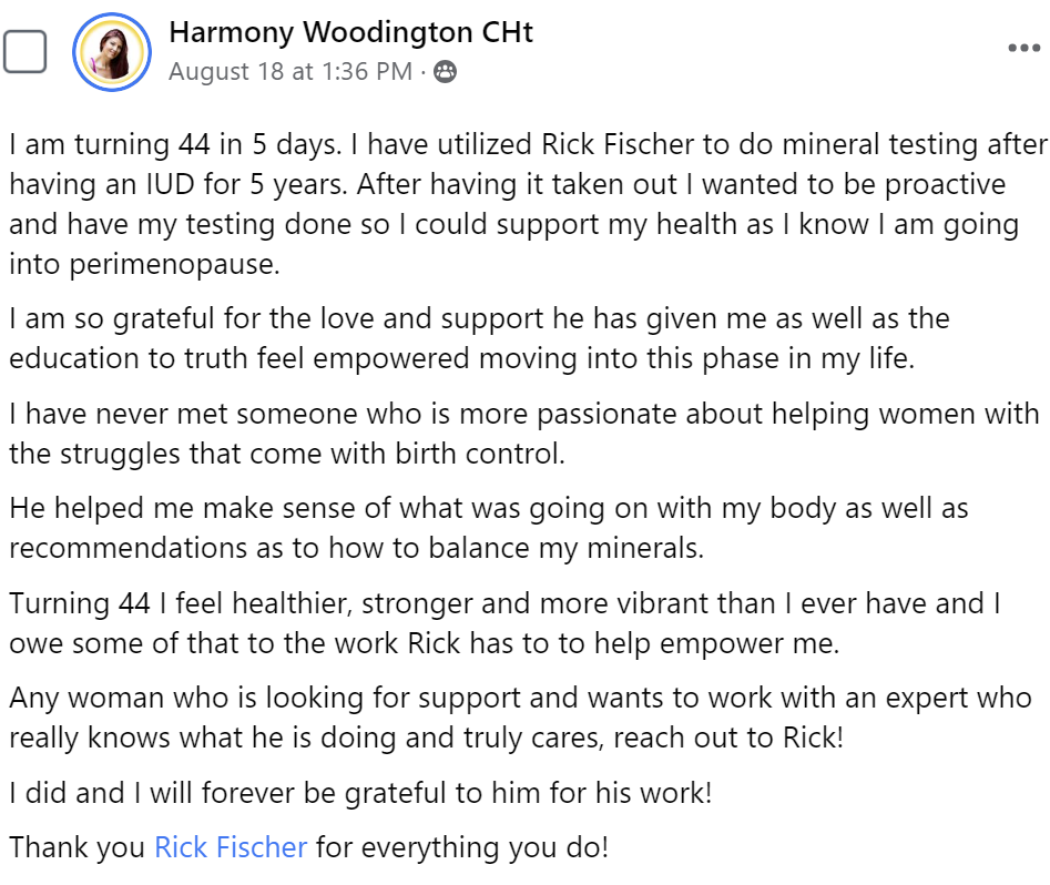 "Listen to this guy! I had my first HTMA with Rick several months back. Hair loss was one of my biggest complaints along with some crazy physical symptoms. My hair did not grow back or change simply from removing the IUD (and I waited almost 3 years). Not only has my hair been growing back with his personalized advice, but the protocol is also reversing my grey hair." ~Vanessa F.